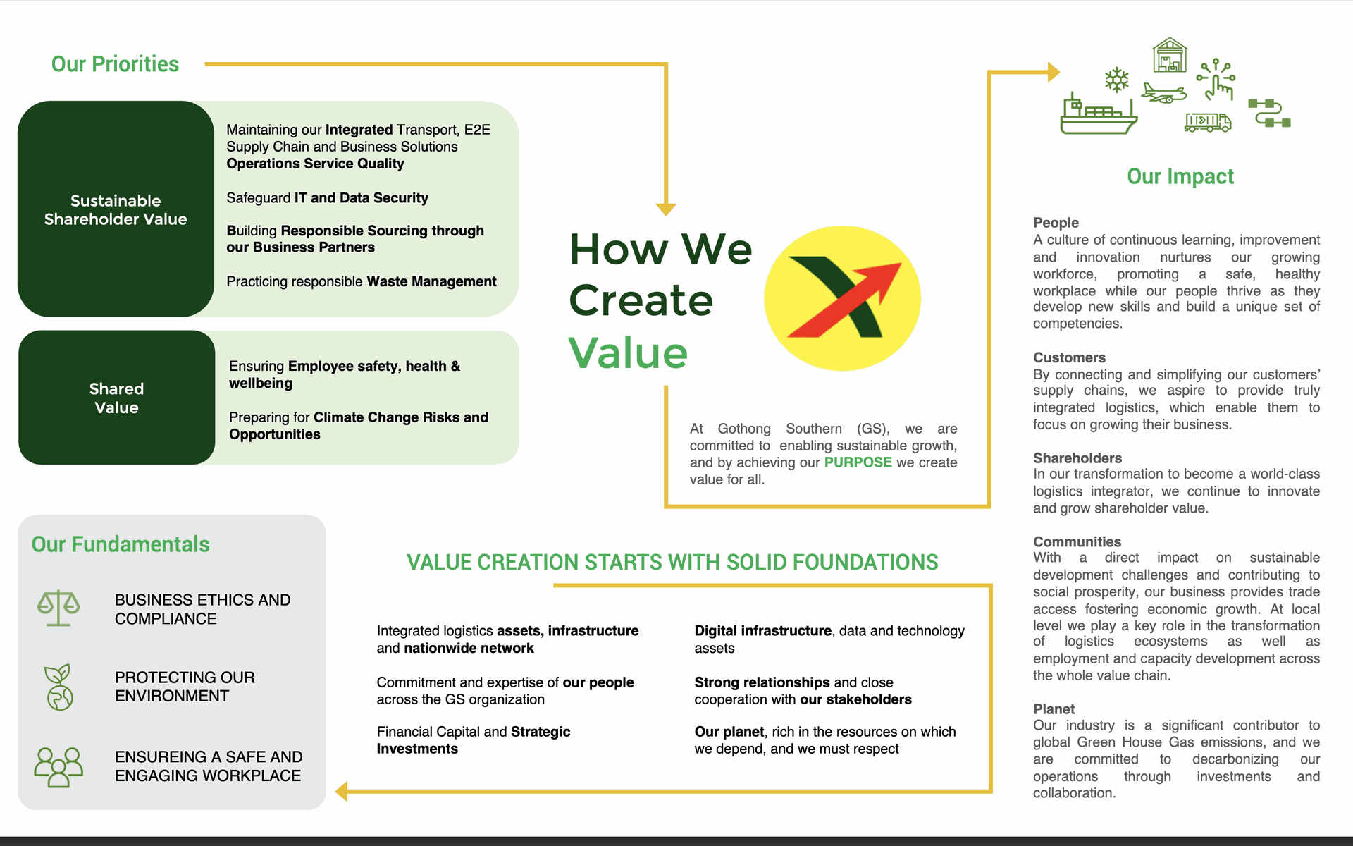 Stems from consistently delivering high-quality integrated transport, end-to-end supply chain, and business solutions. It is reinforced by robust IT and data security, ethical sourcing through trusted partners, and responsible waste management—ensuring long-term profitability, risk mitigation, and positive environmental and social impact that aligns with stakeholders’ expectations and future growth.